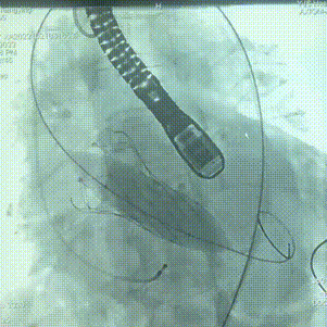 同侧Snare协助下成功将TAV21mm微创瓣膜支架系统沿导丝送达主动脉瓣狭窄处,定位满意后起搏160bpm,缓慢释放支架系统。
