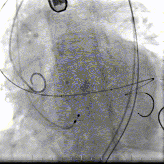 沿导丝送入一枚60*120mm高压球囊于狭窄段7atm*120s扩张,AL1、AL2直头导丝跨瓣,测量压力阶差80mmHg,置于超硬导丝到左心。