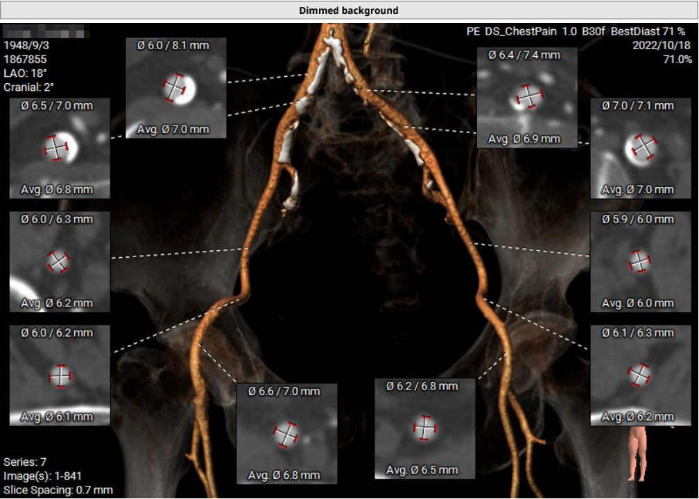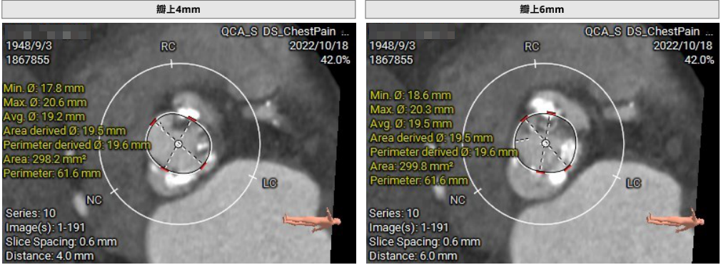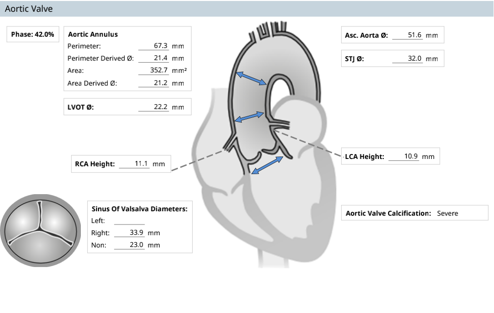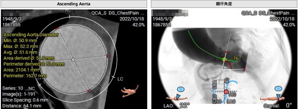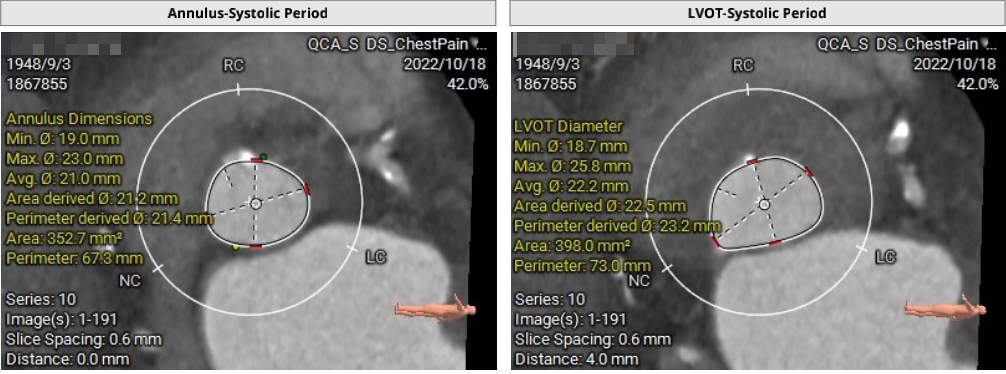 瓣环周长67.3mm,平均径21.4mm,LVOT周长73.0mm,平均径23.2mm;横位心76°,瓣叶交界钙化粘连;股动脉入路迂曲,分叉高度可,髂总-腹主钙化斑块;左侧血管平均最小内径6.0mm, 右侧血管平均最小内径6.1mm;左、右冠开口高度低,瓣叶长,窦宽相对瓣膜小,冠脉风险高。