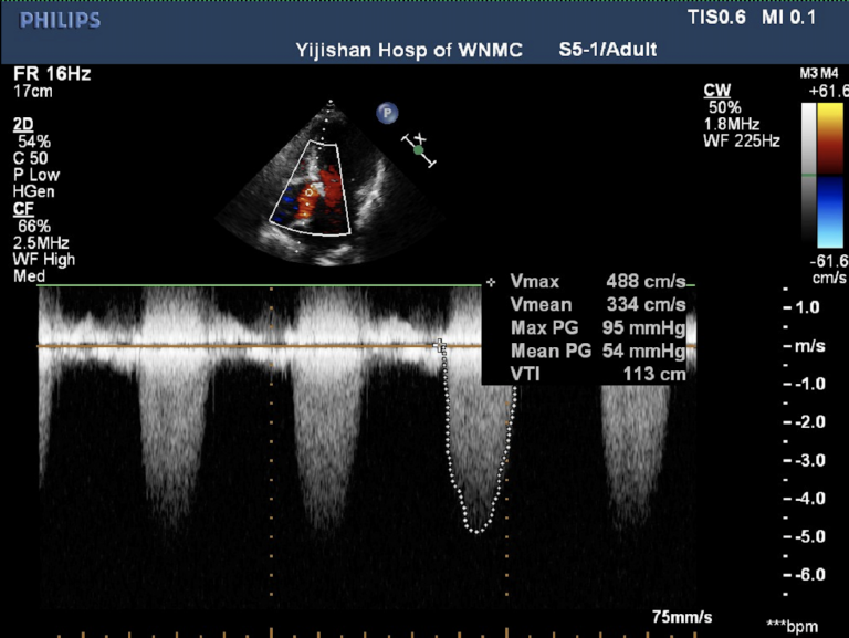 峰值流速4.88m/s,最高跨瓣压差95mmHg,平均跨瓣压差54mmHg,瓣口面积0.57cm²,左室射血分数EF 62%,左室舒张末期内径(LVD)44 mm。