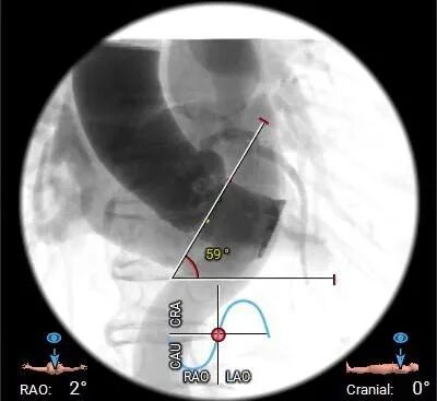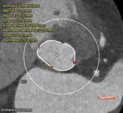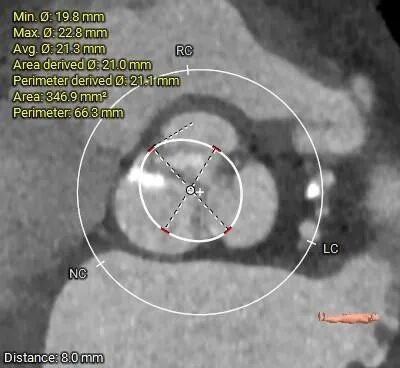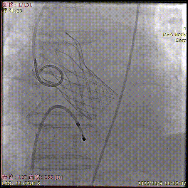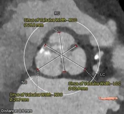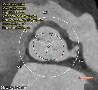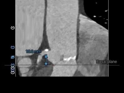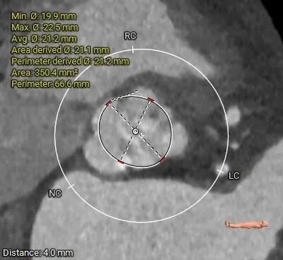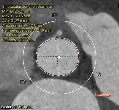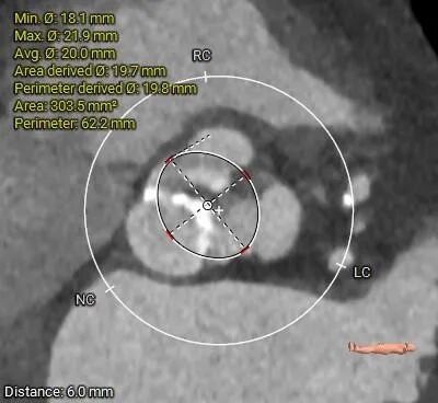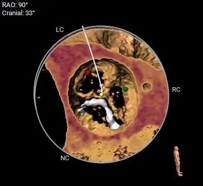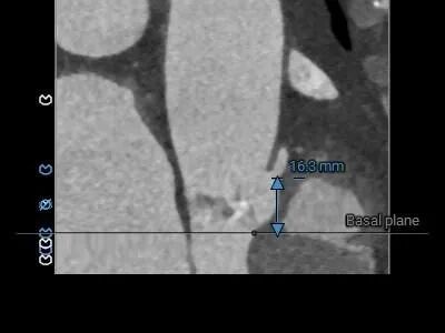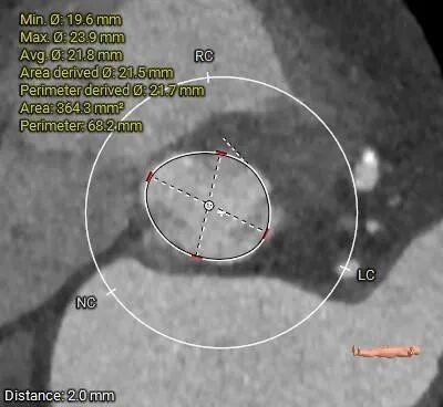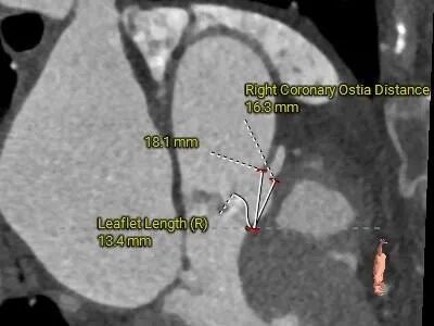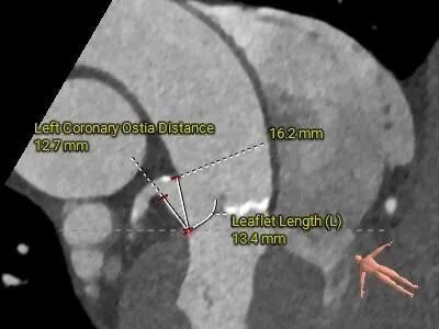 • 左、右冠高度可,切线位测量,左窦瓣叶稍长于左冠开口下缘,结合瓦氏窦、STJ内径综合预估,冠脉阻挡风险适中,术中在瓣膜释放至工作位后进一步观察冠脉灌注情况;