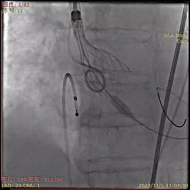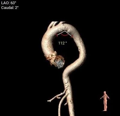 • 接近横位心,升主无扩张,主动脉弓宽度角度可,预估TaurusElite输送器可顺利过弓及跨瓣,弓顶部少许钙化分布,过弓时轻柔操作;
