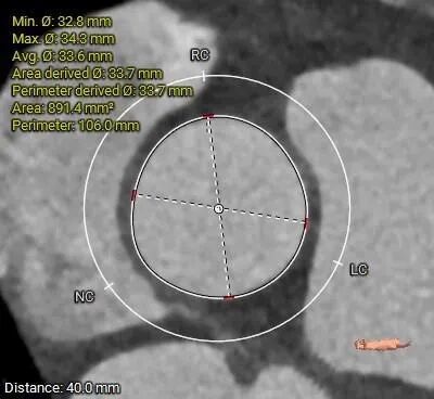 • 瓦氏窦内径尚可,STJ小于30mm,升主动脉无扩张,瓣上40mm处测得约33.7mm;
