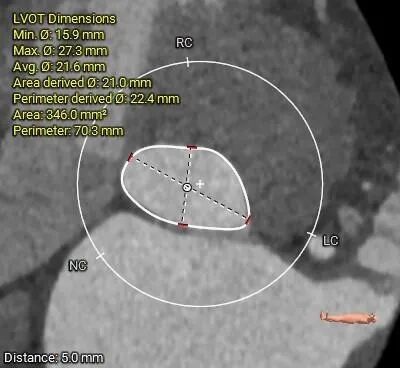 • 三叶式主动脉瓣,瓣叶增厚,R-L交界疑似增厚粘连,轻度钙化,钙化主要沿无冠窦瓣缘分布,LVOT近似直筒型,预估假体瓣膜植入锚定难度适中,结合瓣环及瓣上分析尺寸,选择TaurusElite AV23瓣膜,可以保证充分锚定力且径向支撑性好;