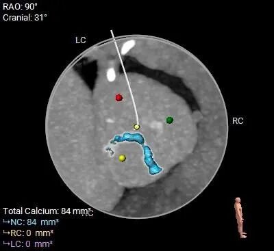 • 左、右冠高度可,切线位测量,左窦瓣叶稍长于左冠开口下缘;左主干及前降支可见部分钙化斑块;