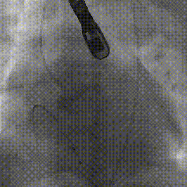 患者全麻,气管插管。经左侧股动脉作为辅入路,将6F猪尾巴导管送至无冠窦窦底,右股动脉作为主入路,右侧股动脉作为主入路,置入18F大鞘,先行主动脉根部造影,可见术前有轻中度返流,行24mm球囊进行预扩,无瓣周漏,无明显腰征,双侧冠脉血流通畅,决定按计划选择27# VitaFlow Liberty™瓣膜,在王建安教授的线上指导、刘先宝教授的现场支持下,将瓣膜释放至功能位,再次造影发现瓣膜位置偏高,遂进行回收,再次释放,最终脱钩,再次造影确认瓣膜位置及形态良好,压差从术前的80mmHg降低至2mmHg,无瓣周漏。