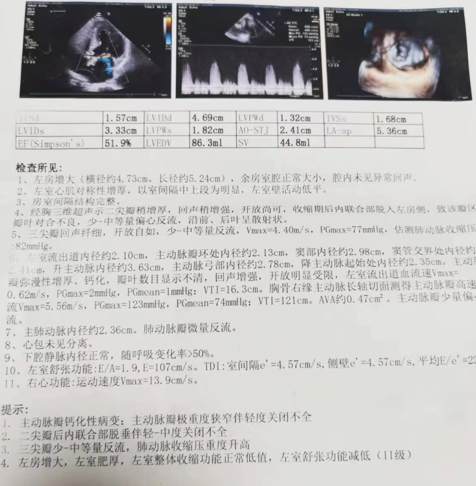1、主动脉瓣钙化性病变:主动脉瓣极重度狭窄伴轻度关闭不全;