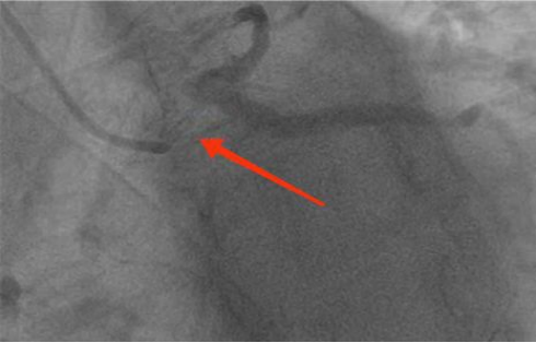 (图示冠脉造影结果:左主干病变。箭头出无明显黑色造影剂通过,提示左主干开口、体部严重狭窄,只有一丝血流通过)