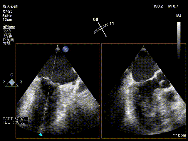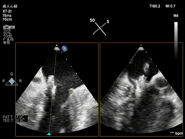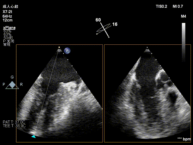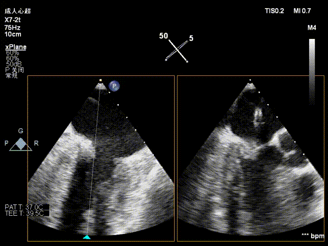 患者取平卧位,消毒铺巾后,穿刺右股静脉后置入6F血管鞘,经食道超声指导下进行房间隔穿刺,穿刺高度约4cm。