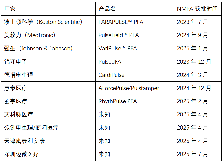 近年来, PFA作为一种非热能消融技术,凭借其高效、精准、低损伤的特点,成为房颤导管消融领域的新兴技术。截至2025年7月,国内已有3款进口、8款国产PFA系统通过国家药监局(NMPA)创新医疗器械特别审查程序并获批上市,获批时间集中于2023-2025年,标志着PFA技术在国内进入临床普及阶段。其中,波士顿科学(Boston Scientific)的FARAPULSE™ PFA系统是目前国内外实际应用最广、发表文章最多和循证证据最充分的PFA系统,与此同时,国产产品的接连获批也打破了国外电生理巨头垄断的市场格局。