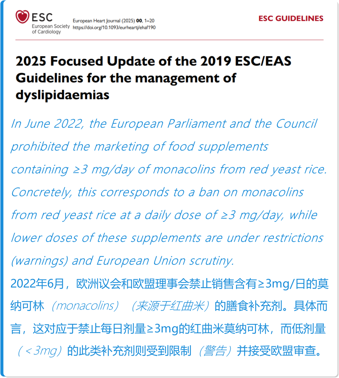 这令人唏嘘的对比背后,隐藏着一个被行业刻意模糊的事实:2022年6月,欧盟通过《Commission Regulation (EU) 2022/860》法规,明确禁止销售含有≥3mg/日的红曲米莫纳可林(monacolins)膳食补充剂,成为全球首个全面限制红曲的地区。而在红曲传统使用区的东亚国家,相关产品仍在合法流通。这种监管差异在2025年欧洲心脏病学会(ESC)发布的《血脂异常管理指南》中被进一步放大——该指南第十章《膳食补充剂》强调:"In June 2022, the European Parliament and the Council prohibited the marketing of food supplements containing ≥3 mg/day of monacolins from red yeast rice. Concretely, this corresponds to a ban on monacolins from red yeast rice at a daily dose of ≥3 mg/day, while lower doses of these supplements are under restrictions (warnings) and European Union scrutiny",红曲制品被列为重点警示案例。