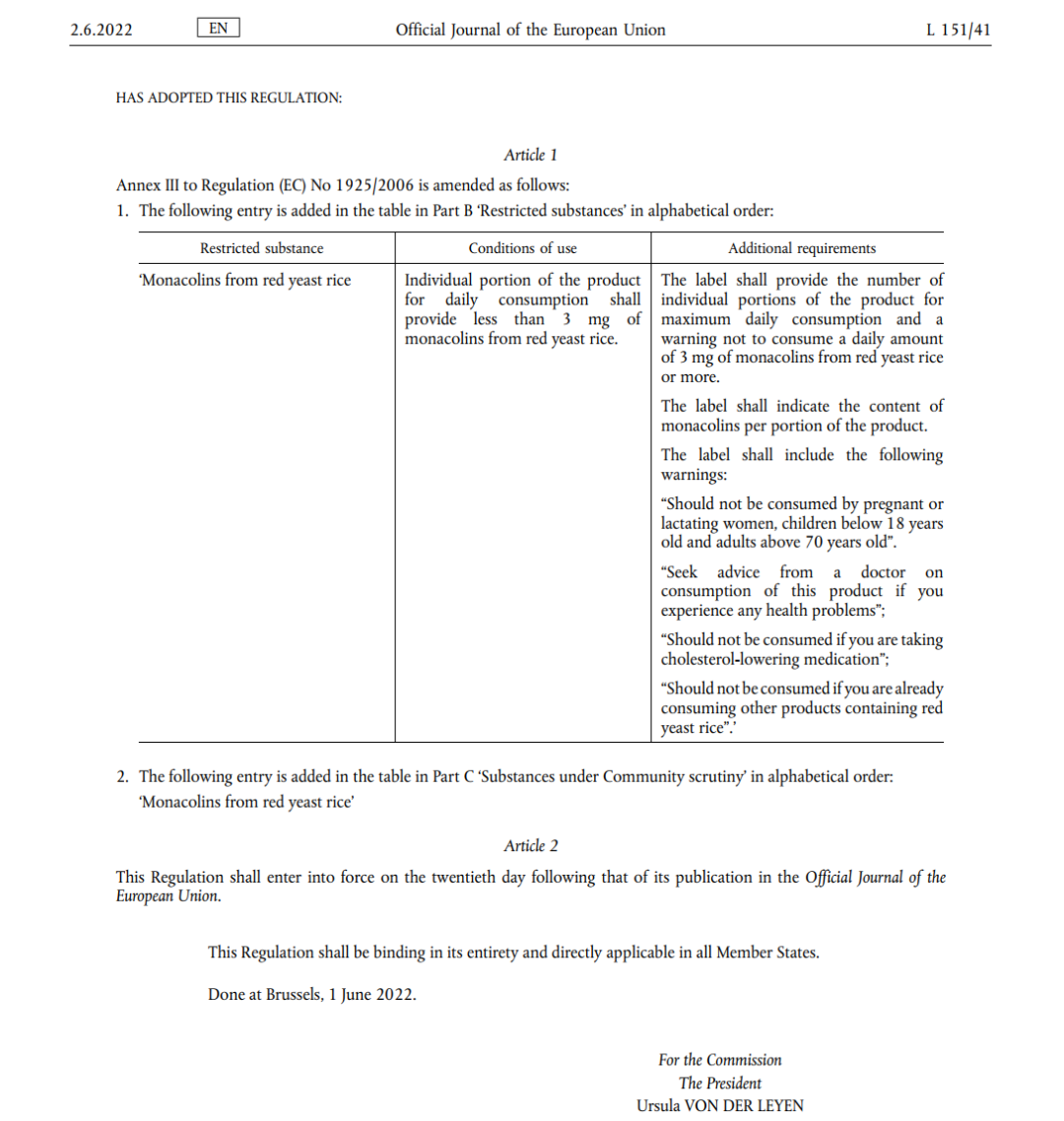 2022年6月1日,欧盟发布《Commission Regulation (EU) 2022/860》,对红曲制品的限制令正式生效。这一法规并非突然出台,而是建立在十余年科学评估基础上的监管决策,体现了欧盟"预防原则"在食品安全领域的具体应用。