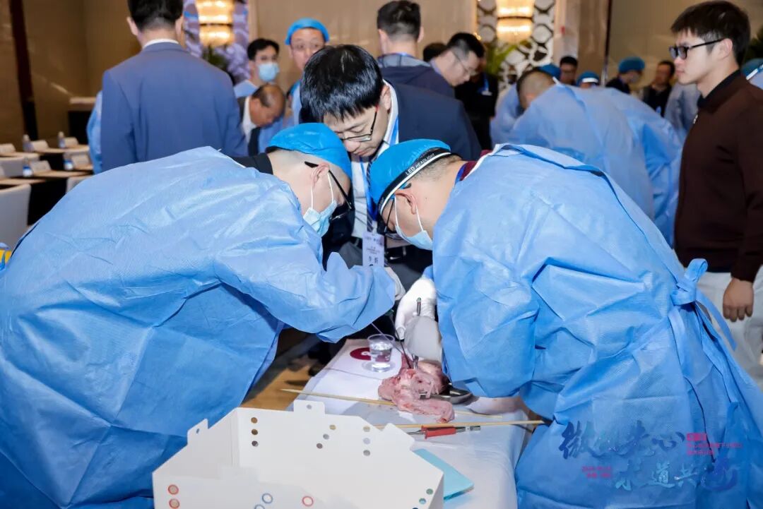 模拟培训部分先由梁维杰教授进行室缺缝合视频及要点操作演练,他提到:“模拟培训的意义在于缩短学习曲线、提升操作熟练度,并帮助年轻医生快速掌握腋下小切口微创技术。通过现场导师的实时点评和答疑,学员不仅能理解手术的关键步骤,更能对解剖、病理特点及操作要点形成深层次认知,这对于未来临床实际操作帮助极大。”随后的实操环节采用导师小组模式,指导来自全国各地大型中心与地方医院的学员在猪心标本上进行仿真操作,练习手术路径、缝合技巧及器械应用。