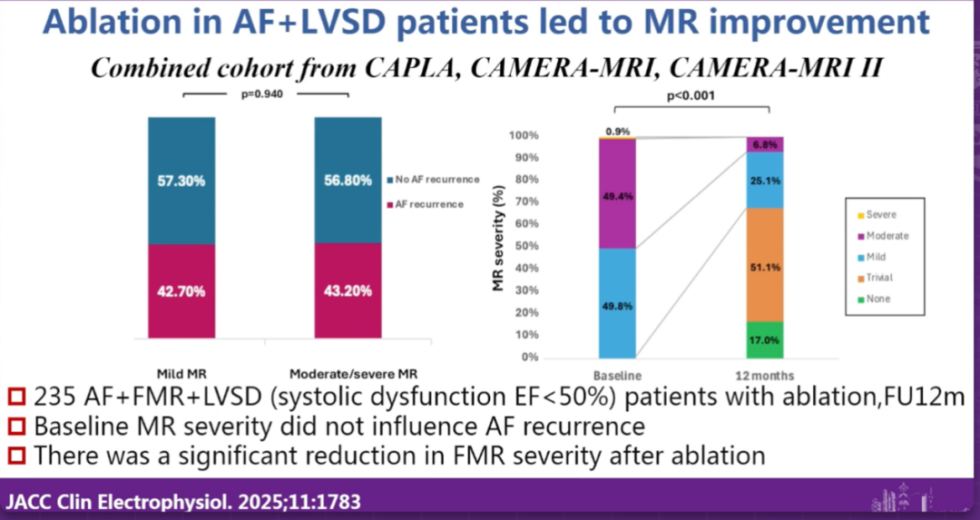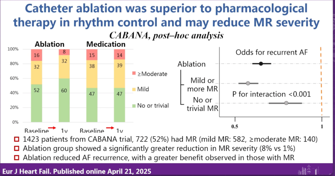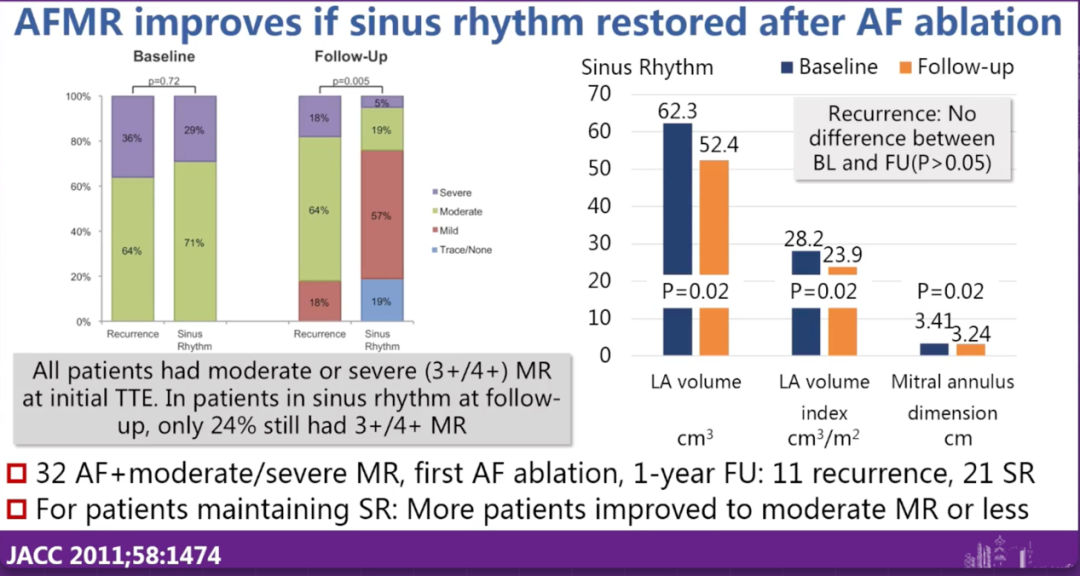 在讨论环节中,他特别强调,若患者已出现明显瓣叶脱垂,则TEER更为合适;而在以瓣环扩张为主的AFMR病例中,可尝试先行房颤消融并随访MR改善。他建议,临床可通过三维超声或CT等影像学参数评估瓣环扩张程度和左房体积变化,从而预测消融后的反流改善情况。