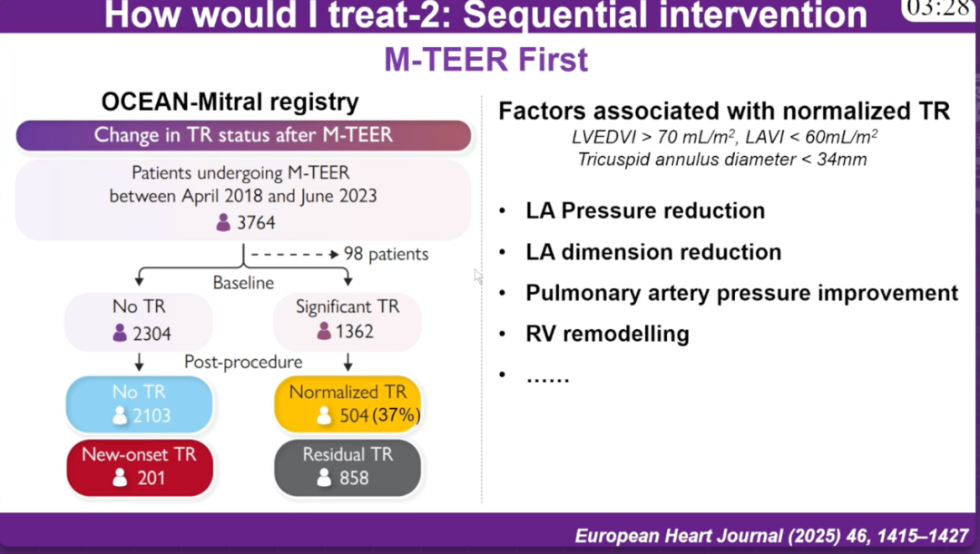 三尖瓣优先策略(Tricuspid Intervention First):基于TriValve注册研究的639例患者数据,在359例研究队列中,30%的患者二尖瓣反流得到改善。与二尖瓣反流改善相关的因素包括三尖瓣反流减至中度、利尿剂剂量增加、LVEDd > 60mm,以及右房/右室压力/容量减少、更好的GDMT和室间隔正常化等。
