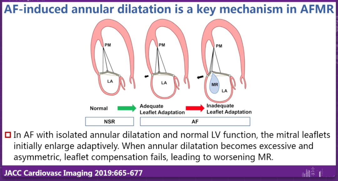 马长生教授围绕房性功能性二尖瓣反流(AFMR)的治疗策略进行了深入讲解,重点分析了房颤消融在改善反流程度中的作用和机制。他指出,AFMR的主要发病机制是长期房颤导致的左心房扩大和瓣环扩张,造成瓣叶对合不全,但瓣叶结构多为正常。因此,这类反流具有可逆性。