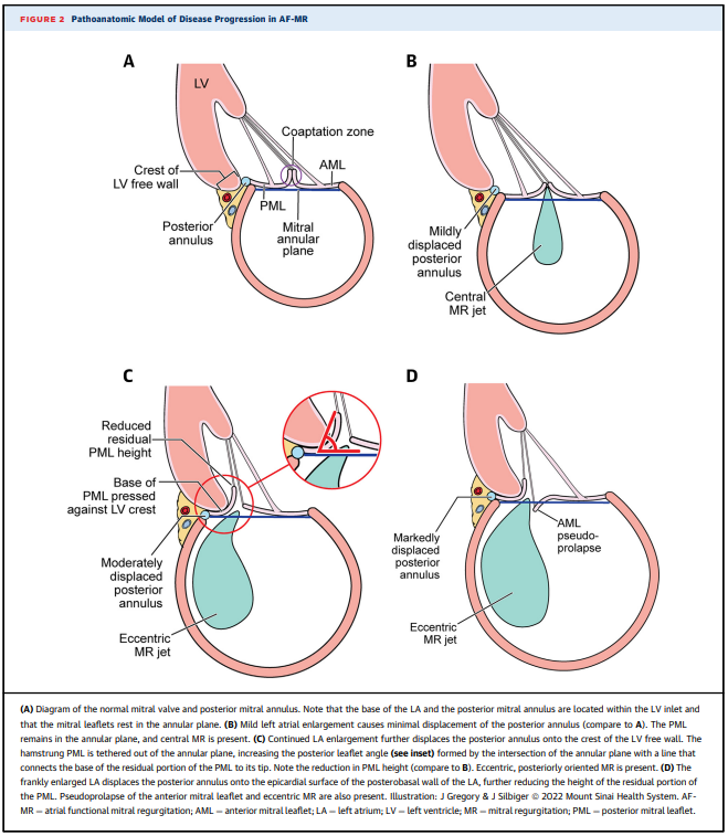 2022年发表的一项重要研究首次系统提出了房性功能性二尖瓣反流(AF-MR)的概念,将其与传统的心室性功能性二尖瓣反流(VF-MR)区分开来(Farhan et al., 2022)。房性功能性二尖瓣反流主要与左心房扩大和二尖瓣环扩张相关,在心房颤动和射血分数保留的心力衰竭(HFpEF)患者中尤为常见。这一认识的突破性意义在于,它提示我们需要针对不同病因采取差异化的治疗策略。