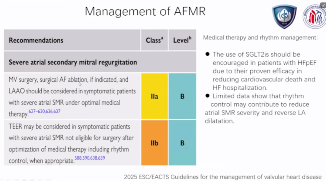 葛均波教授从2025年最新版欧洲心脏病学会/心胸外科学会(ESC/EACTS)指南出发,系统阐述了功能性二尖瓣反流管理策略的更新要点。他指出,指南首次将房性功能性二尖瓣反流(AFMR)独立分类,与心室性二尖瓣反流(VFMR)区分开来,这标志着临床对FMR病理机制认识的进一步深化。AFMR主要源于心房扩张和瓣环形态改变,表现为正常的左室大小和射血分数但伴有明显的左心房扩大;而VFMR则与左室重构和乳头肌牵拉相关,通常发生在射血分数降低的心力衰竭患者中。