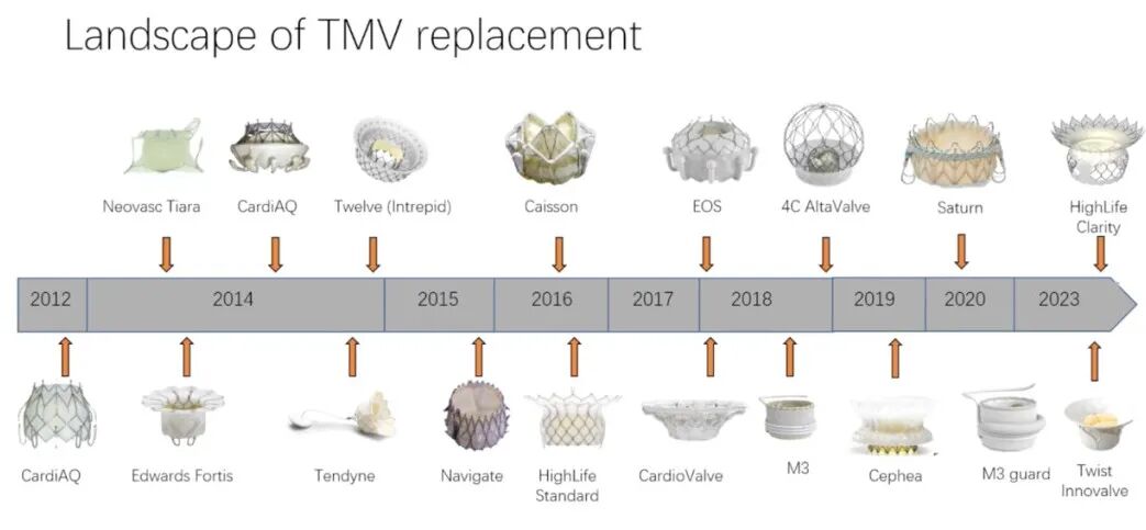 Piazza教授展示了TMVR技术的快速发展轨迹。从2012年至2023年,多种装置相继问世,包括Tendyne、Intrepid、M3、Highlife等系统,形成了丰富的技术谱系。