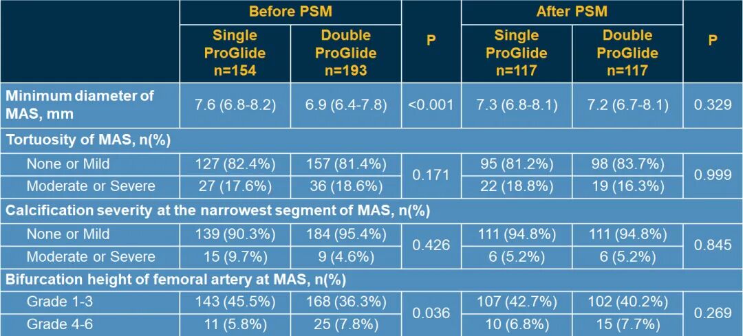 倾向评分匹配(PSM)前,单把ProGlide 组(n=154)与双把ProGlide 组(n=193)在部分指标上存在统计学差异。其中,单把ProGlide 组的 STS 评分(3.3% vs 2.7%,P=0.006)、CABG 手术史比例(3.2% vs 0.0%,P=0.017)、PAD 患病率(9.1% vs 3.6%,P=0.034)均高于双把ProGlide 组。