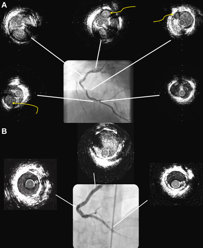 (A)从 RCA 近端到 PDA 可见多个血液充盈的管腔(黄色箭头)。(B)经皮冠状动脉介入治疗(PCI)后血管内超声图像显示支架膨胀良好,以及 PDA 远端节段健康。