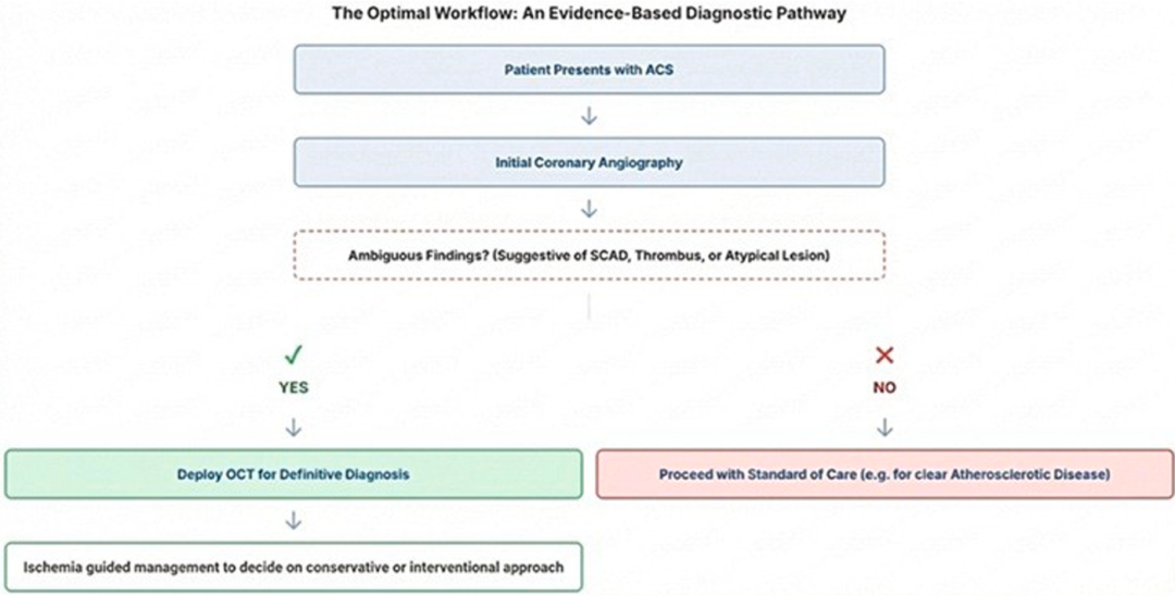 在急性冠脉综合征的诊治中,自发性冠状动脉夹层(SCAD)因其易与血栓再通混淆,而成为诊断难题。传统冠状动脉造影经常对病变进行错误分类,而光学相干断层扫描(OCT)凭借其超高分辨率,成为区分这两类病理本质、指导精准治疗的关键工具。