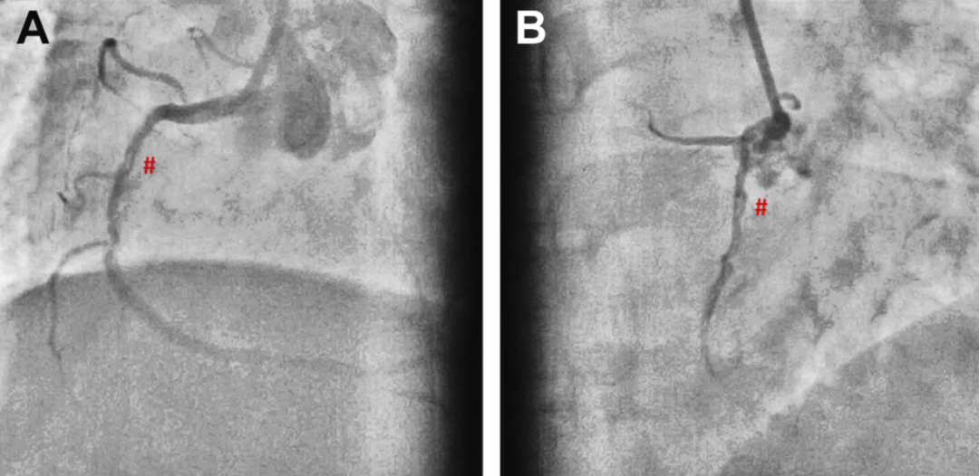 投照角度:左前斜头位(A)和右前斜位(B)的冠状动脉造影显示管腔不规则(#),最初被解读为自发性右冠状动脉(RCA)夹层。造影显示管腔直径的突然变化,这种变化可能不明确,易与机化血栓相混淆。