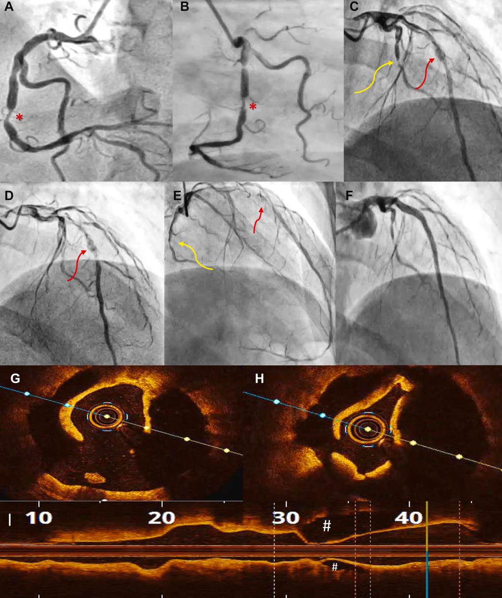 (A)左前斜头位视图显示右冠状动脉(RCA)中段疑似3型 SCAD(∗)。(B)右前斜位视图显示右冠状动脉(RCA)疑似 SCAD(∗)(C-E)。左前降支(LAD)中段可见可疑充盈缺损(1型 SCAD/再通血栓)伴有造影剂延迟清除(红色箭头),以及左回旋支(LCX)/钝缘支(OM)疑似3型 SCAD(黄色箭头)(F)。左前降支(LAD)最终 PCI 结果(G 和 H)。左前降支(LAD)管腔被向内推挤;假腔用 # 标示(I)。OCT的 L 模式:真腔被假腔(#)向内推挤。