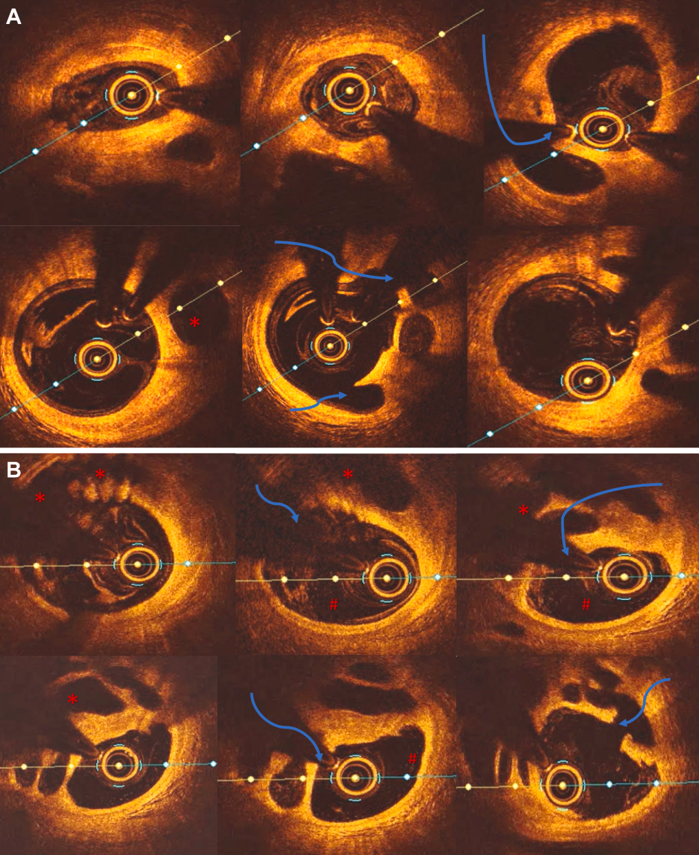 (A)LAD:壁内血肿(∗)、内膜破裂(蓝色箭头)以及管腔被向内推挤。(B)LCX 显示第二个管腔朝向9点至3点钟方向形成(∗),真腔(#)被推向3点至6点钟方向;可见清晰的内膜破口(蓝色箭头)。
