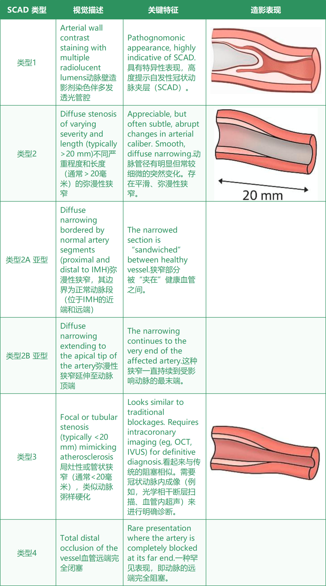 造影无法显示冠状动脉管壁各层,这限制了对SCAD的明确诊断。常见的造影特征(如伴有造影剂染色的内膜撕裂、多个透明管腔、突然的管径变化)可能与其他情况类似,例如血栓再通或动脉粥样硬化,从而导致误诊和不恰当治疗。