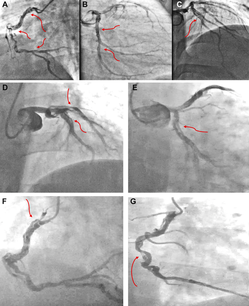 2018年在另一家中心,(A)右冠状动脉(RCA)疑似自发性冠状动脉夹层(SCAD)。(B)左回旋支动脉(LCX)和(C)可能遗漏的左前降支动脉(LAD)SCAD。2024年在我们中心,被解读为(D)近段 LAD 的 SCAD 以及(E)粗大非优势 LCX 的广泛 SCAD(红色箭头)并累及主要钝缘支(OMM),(F 和 G)右冠状动脉(RCA)自开口至后降支(PDA)和后左室支(PLV)的广泛 SCAD(红色箭头)。