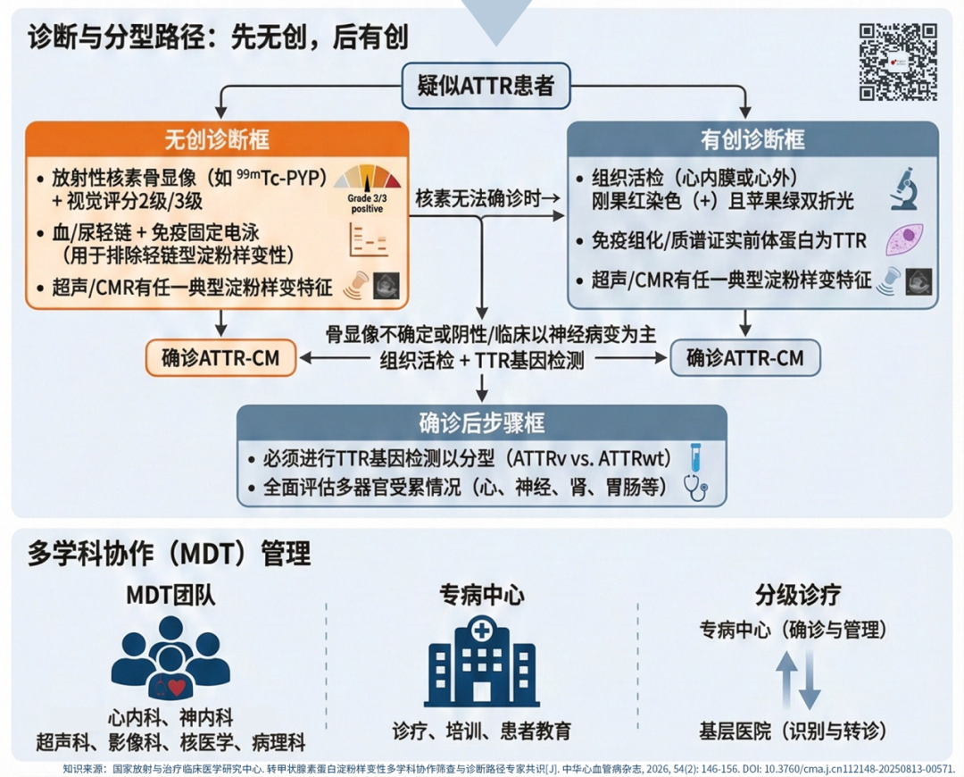 近日,国家放射与治疗临床医学研究中心组织多领域专家,基于最新循证医学证据和最佳临床实践,撰写了《转甲状腺素蛋白淀粉样变性多学科协作筛查与诊断路径专家共识(2026)》,发表在最新一期《中华心血管病杂志》上。本共识旨在制定一套契合中国临床实践的多学科协作筛查与诊断路径,以推动ATTR的早期确诊与及时治疗。