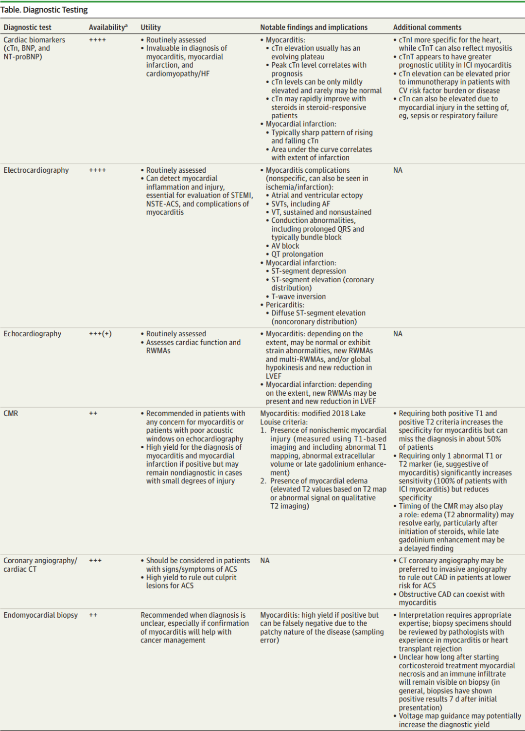 需明确的是,无任何单一的临床或影像学表现为ICI相关心肌炎所特有,这些异常也可见于其他多种心血管疾病,诊断需结合相应的临床背景。若需快速明确临床诊断,或无创评估后诊断仍不明,心内膜心肌活检可有帮助;若需组织学确诊或对心肌炎进行病理严重程度分级,以制定后续癌症治疗方案,该检查也具有价值,尤其是心脏磁共振成像结果不具特异性时。