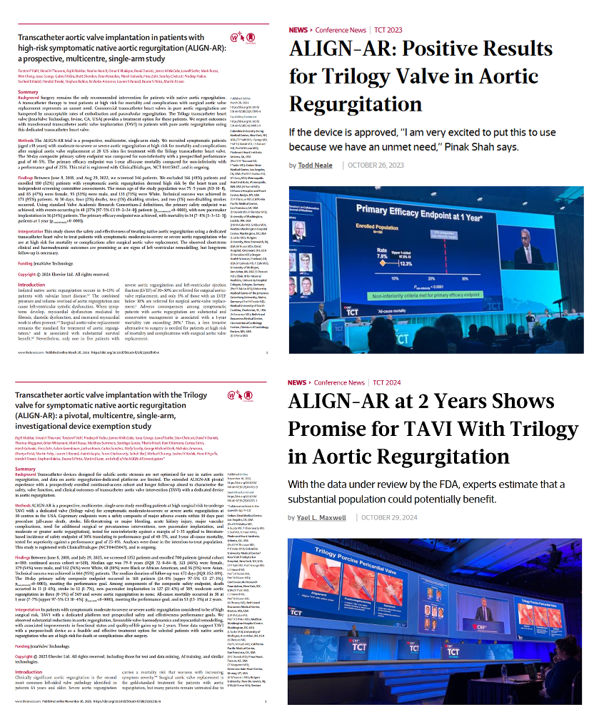 ALIGN-AR 研究全球项目主席,哥伦比亚大学医学中心/纽约长老会医院介入血管治疗中心Martin B. Leon对这一创新疗法在美国获批给与了很高评价和期待:“With what we have learned about the Trilogy valve from the ALIGN-AR trial, we now have the answer to a question that the cardiology community had struggled with – can we safely and effectively treat patients with severe AR with a transcatheter device? The answer is yes. The unique design of the Trilogy System — with its locator technology providing secure anchoring even in the absence of calcium — addresses the fundamental challenge that has made AR so difficult to treat. This approval establishes a new standard of care for high-risk AR patients and is a landmark achievement for the field of interventional cardiology.”