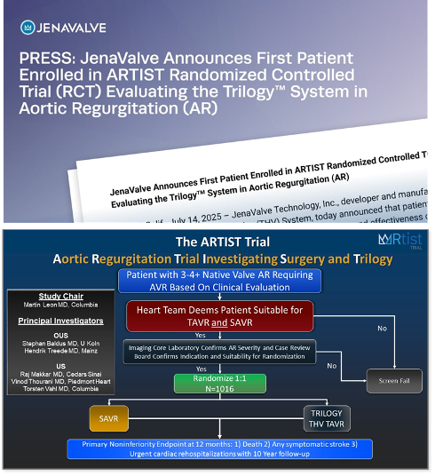 Trilogy的FDA获批是重要里程碑,但绝非终点。ARTIST研究作为全球率先在AR领域头对头比较TAVR与外科手术(SAVR)的随机对照试验,已于2025年7月启动入组。该研究计划在美国及海外90个中心纳入超1000例中重度AR患者,1:1随机分配至Trilogy TAVR组或SAVR组,主要终点为12个月全因死亡、卒中和非计划心脏再住院的复合终点。ARTIST旨在将Trilogy的循证证据从高风险人群向更广泛的外科可手术人群拓展。其结果不仅将影响未来国际临床指南的修订,更可能推动TAVR从“高风险患者的备选”升级为AR治疗领域更广泛人群的一线治疗方案。