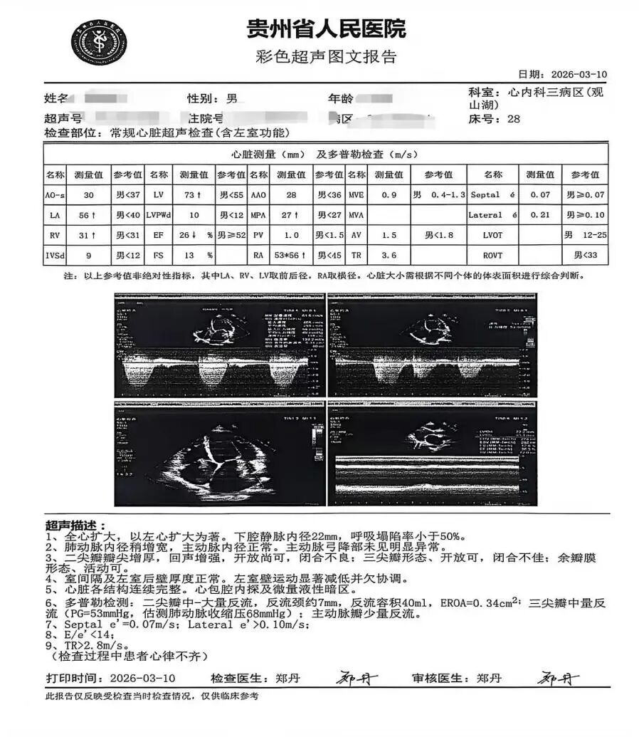 心脏超声:全心扩大左心扩大为主(左房56mm 左室 73mm),EF 26%,二尖瓣中-重度反流、三尖瓣中度反流,肺动脉压68mmHg;