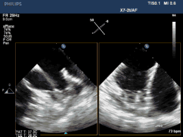 3. 经右侧股静脉置入SL1鞘管,沿鞘管送入房间隔穿刺针,食道超声下见左心耳血栓