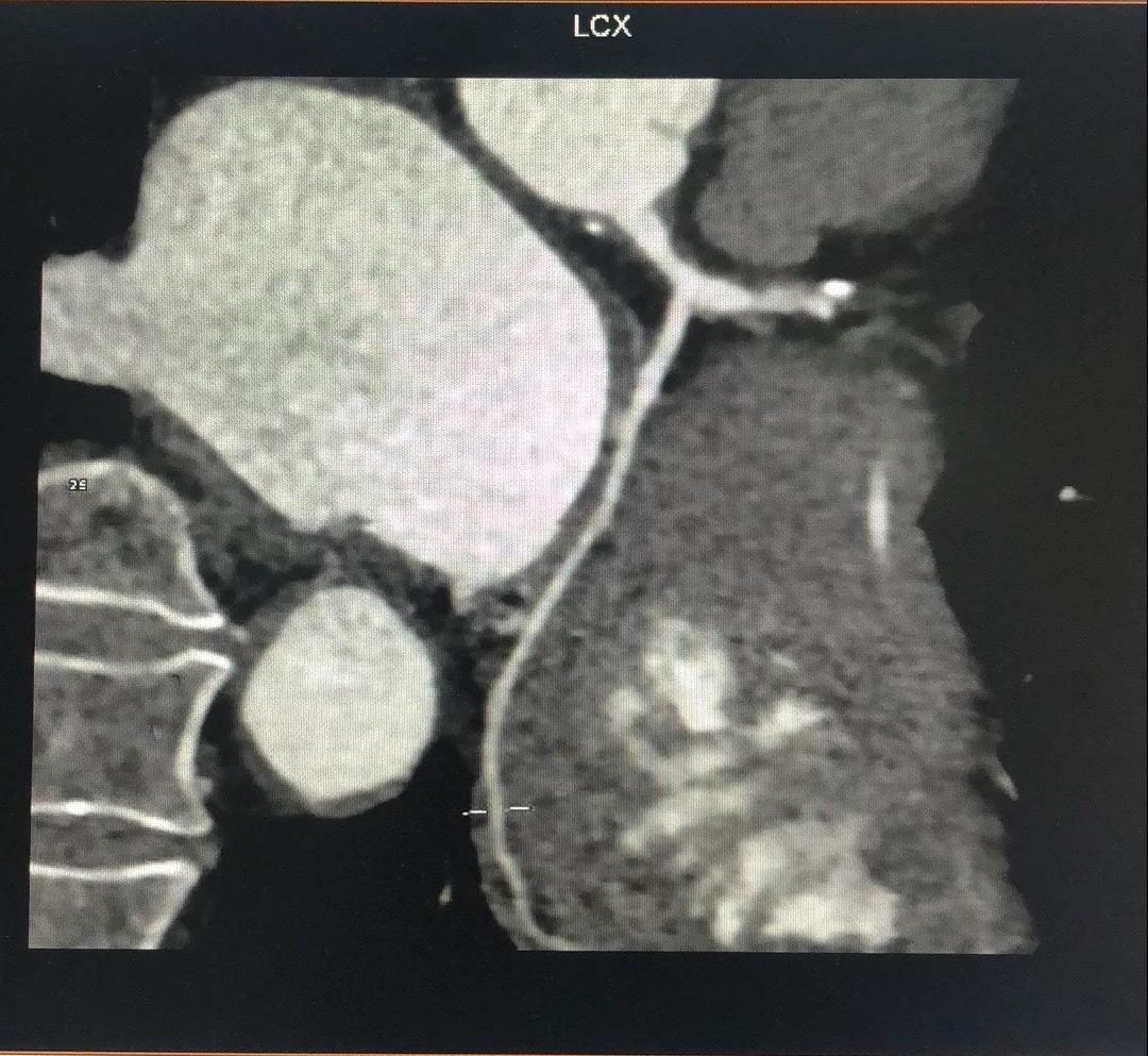2、LCX近中段发出比较粗大的侧枝逆向供应右冠左室后支,侧枝血管仅轻度扭曲;
