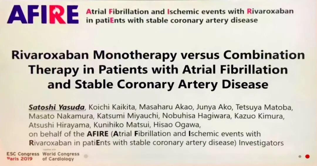 冠状动脉介入治疗之后需要双联抗血小板治疗,房颤患者需要进行抗凝治疗,而当冠脉介入治疗患者合并了房颤又该如何临床决策呢?目前指南建议三联治疗(口服抗凝血剂+阿司匹林+P2Y12抑制剂)后进行双联治疗(口服抗凝剂+P2Y12抑制剂),总共使用12个月。但是对于1年之后的治疗策略,虽然指南建议服用一种口服抗凝药,但是却没有相应的临床试验的支持,现在我们就来看一看AFIRE研究是如何回答这一问题的。