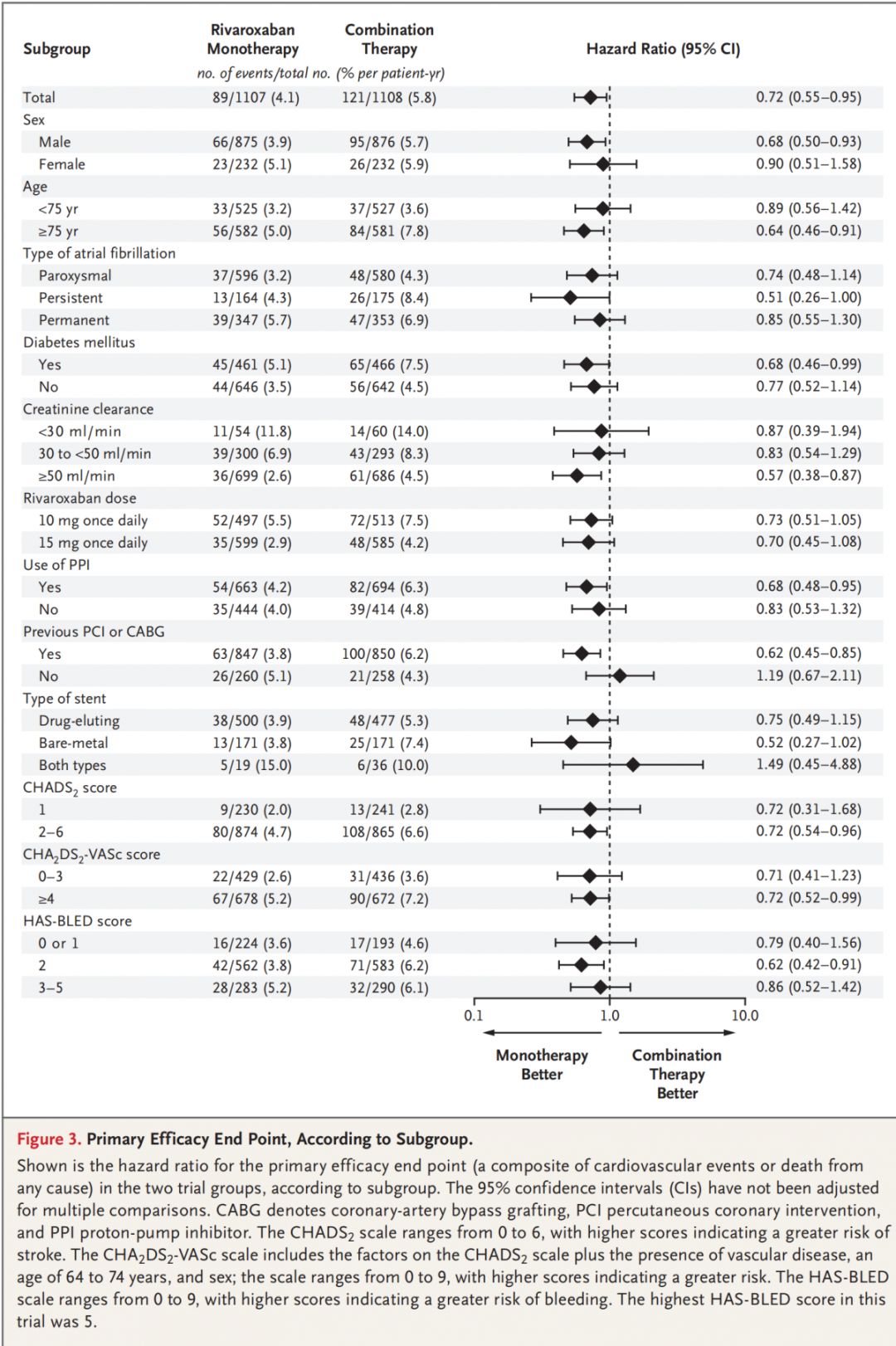 选定的亚组分析:在主要有效性终点方面,与联合治疗相比,单一治疗的效果在所有预先指定的亚组中基本一致,包括根据性别、年龄、卒中和出血风险评分以及肾功能定义的亚组(Figure 3)。