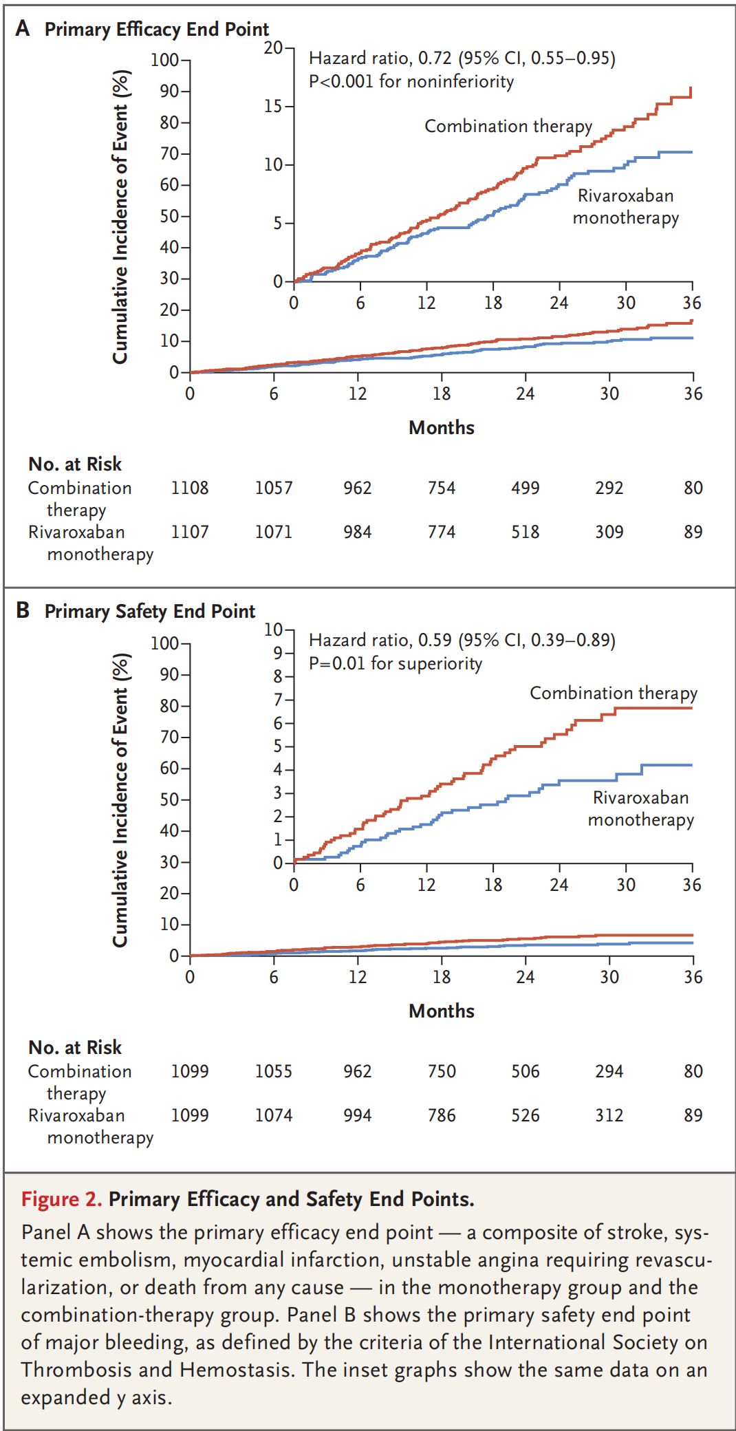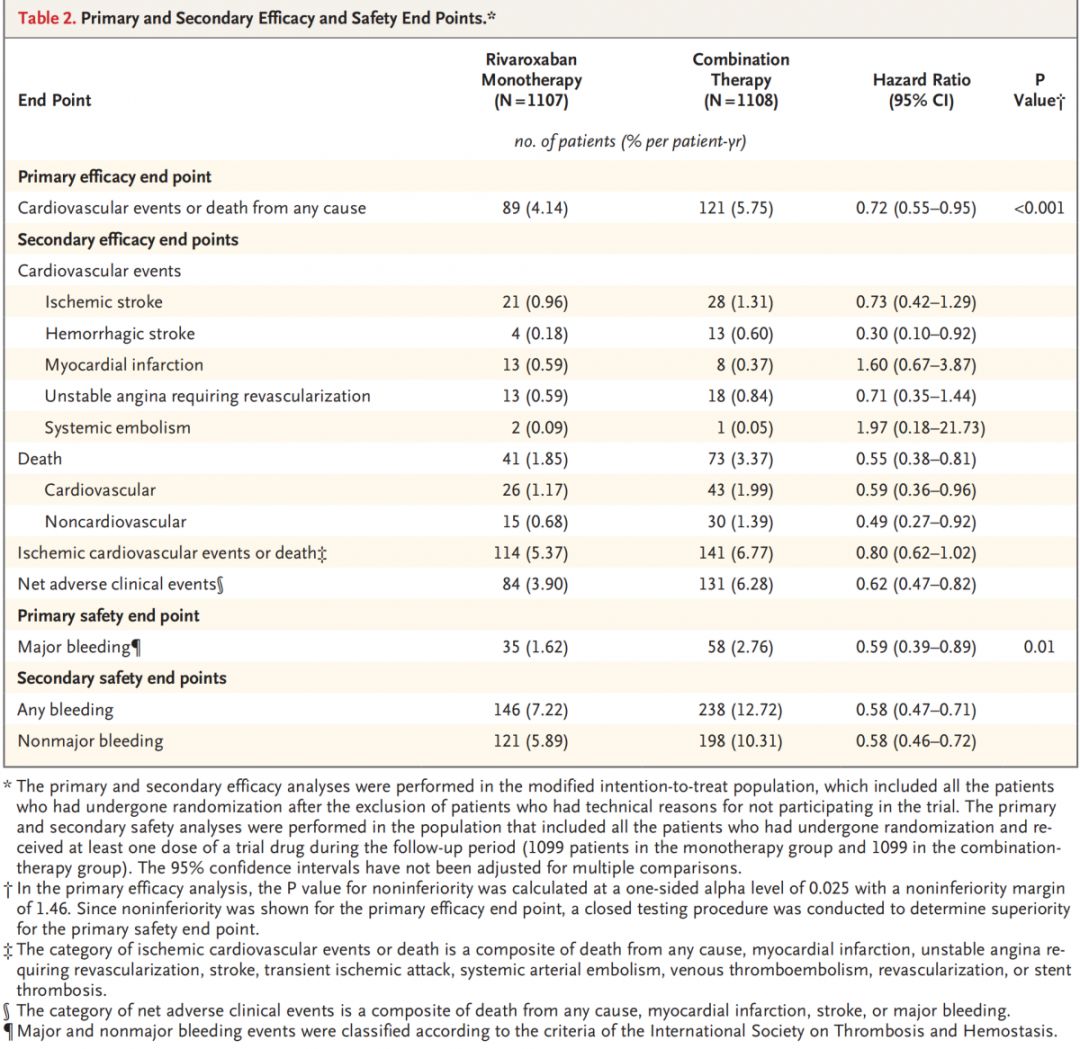 单药治疗组缺血性心血管事件或死亡的复合终点发生率低于联合治疗组,分别为每患者每年5.37% 和6.77% (HR 0.80; 95% CI, 0.62 - 1.02)。单纯治疗组的临床净不良事件发生率(全因死亡、心肌梗死、卒中或大出血)低于联合治疗组,分别为3.90%和6.28% (HR 0.62;95% CI, 0.47 - 0.82)。单一治疗组的非大出血事件发生率低于联合治疗组,分别为5.89%和10.31%(HR 0.58; 95% CI, 0.46 - 0.72)。每组均有2例致死性出血事件