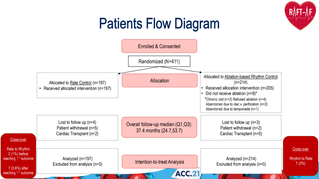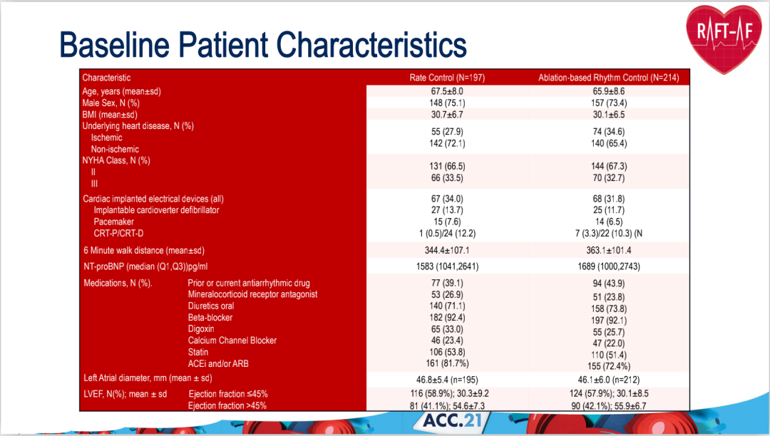 患者以1:1的比例被随机分到心率控制组或者导管消融治疗组。心率控制组:患者接受最优方案的心衰治疗和心率控制治疗,使患者静息心率< 80 次/分,6分钟步行心率< 110次/分。导管消融为基础的节律治疗组:患者接受最优方案的心衰治疗和一种或多种侵入性的导管消融,包括肺静脉前庭隔离和左房基质消融,使用或不使用辅助的抗心律失常药物。一级终点是:全因死亡率和心力衰竭住院的复合终点,心力衰竭入院定义为在医疗机构的住院。实际入组411人。