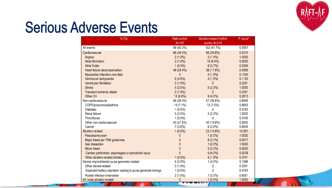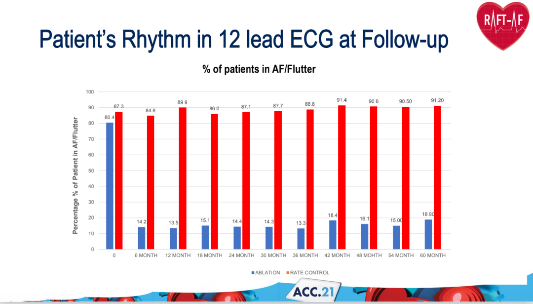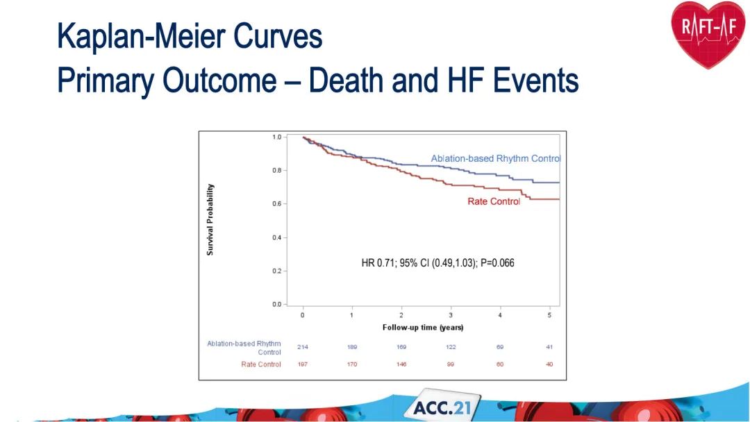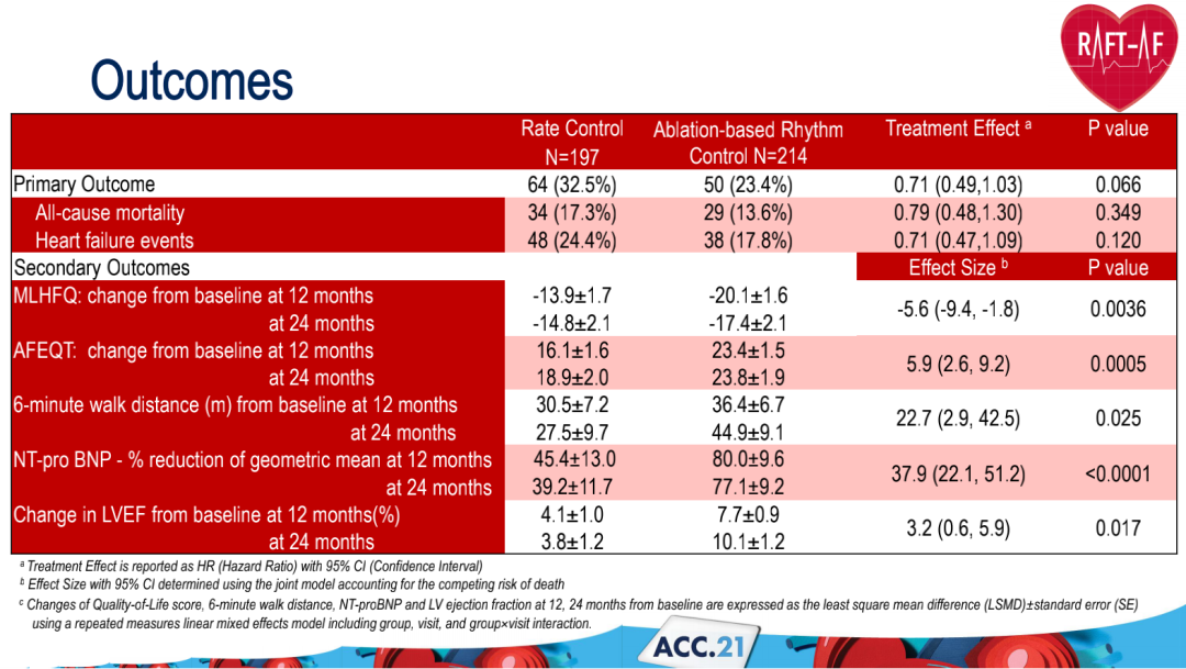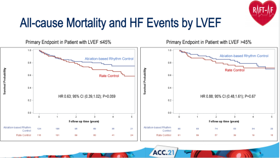 1. 在这项针对房颤和心衰患者的试验中,以消融为基础的心律控制与心率控制相比,降低全因死亡率和心衰事件没有达到统计学意义。