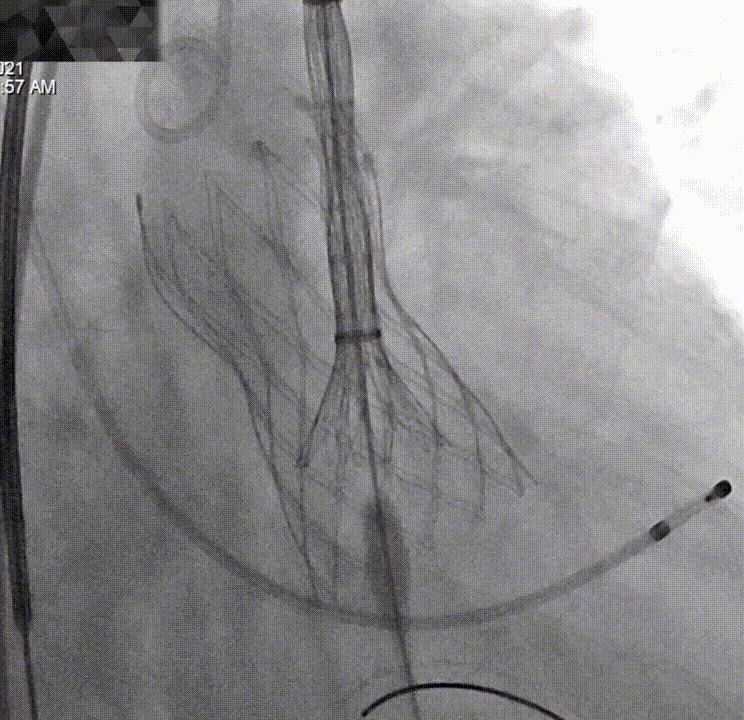 对于单纯返流患者来说,术前也分析了瓣膜移位的风险比较高。结合术前的分析与术中的情况,为保证患者的治疗效果,术中进行了“瓣中瓣”的策略,即第一个瓣膜在非稳定状态下作为锚定骨架,便于第二个瓣膜顺利植入并重建血流动力学。