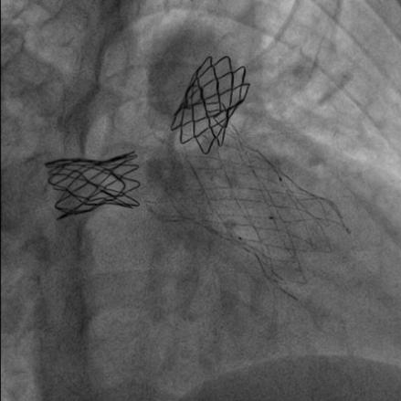 患者在全麻下,首先从左股静脉将造影导管分别送至右心室和肺动脉主干,行造影以明确右室流出道、肺动脉及肺动脉分支的基本情况。同时测量了右室流出道及肺动脉的尺寸。随后输送器通过右侧股静脉延加硬导丝将瓣膜输送到右室流出道,在X线的引导下,将瓣膜精确定位到植入部位并顺利进行瓣膜释放,无反流和瓣周漏,手术效果十分理想。