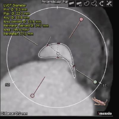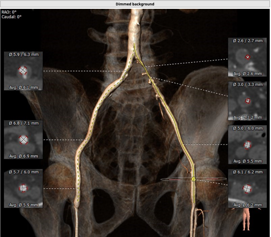 结合CT分析,李自成教授团队考虑使用右侧股动脉做为主入路,由于左侧髂总动脉近腹主动脉分叉处局部狭窄,考虑副路选择桡动脉;拟选用VenusA-Plus 26型号瓣膜植入。