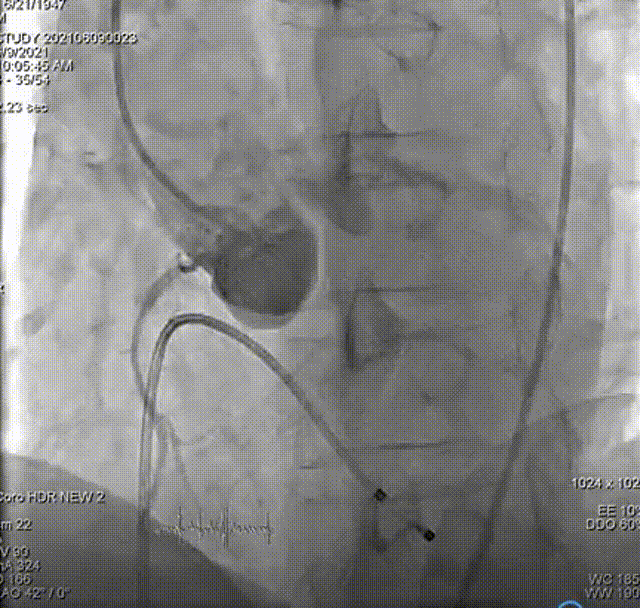 主动脉根部造影,双侧冠脉血流未见明显异常。