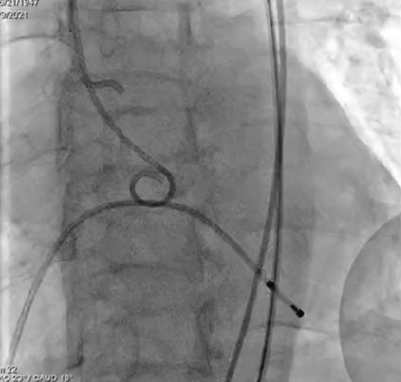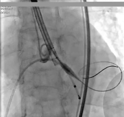 输送系统输送至窦底,行主动脉根部造影,借助无冠窦猪尾造影定位,由于该患者基础心率较缓慢,瓣膜无起搏顺利释放。