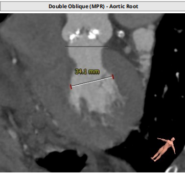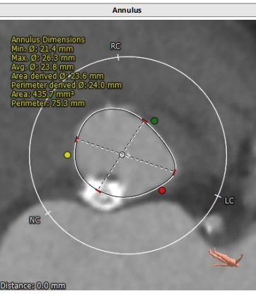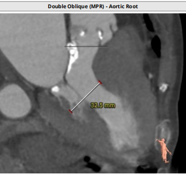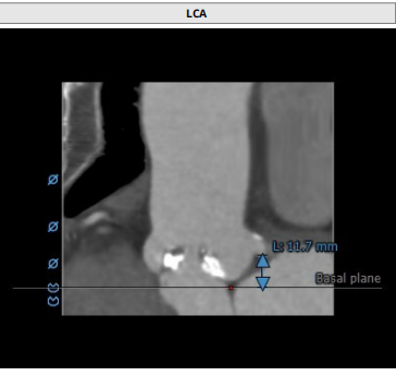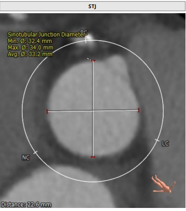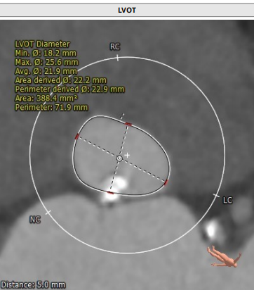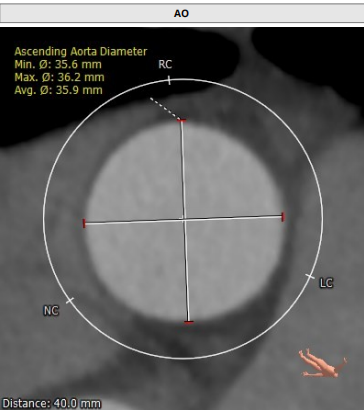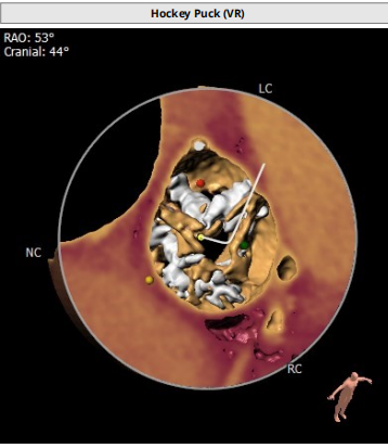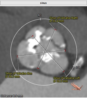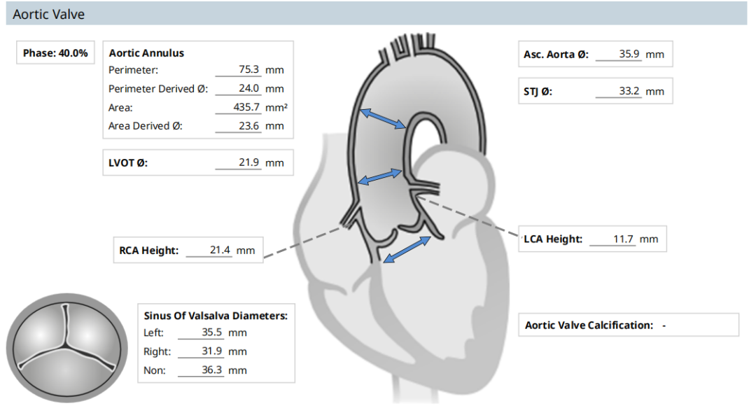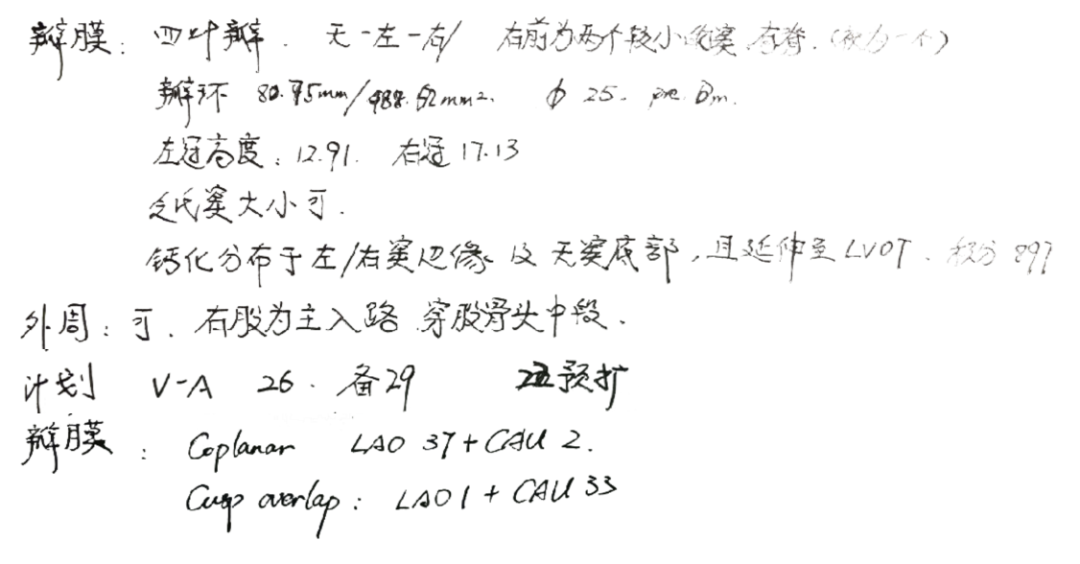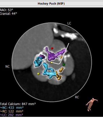 CT分析:四叶瓣、重度钙化、瓣环钙化延伸至左室流出道、冠脉高度可,法式窦大小可,心脏角度不大,左室大小可,升主动脉未见明显增宽,Venus-A瓣膜具有较强的径向支撑力,考虑到患者重度钙化,结合主动脉根部结构,考虑植入Venus-A Valve。