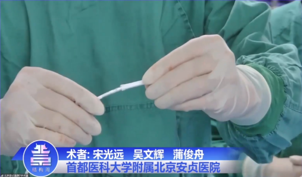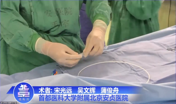 术中经右股静脉穿刺,对主动脉进行血管造影再次确认患者情况,并确定植入支架尺寸。随后,吴文辉教授通过信息采集机器人的高清摄像设备展示了专用于主动脉缩窄的可生长支架CP支架的组装过程,并具体讲解了与之配套的BIB球囊使用方法和效用,该球囊具有双层囊状结构,可均匀扩张CP支架,从而避免形成漏斗形、哑铃形。